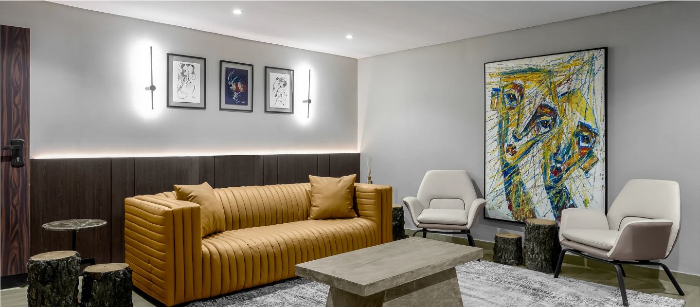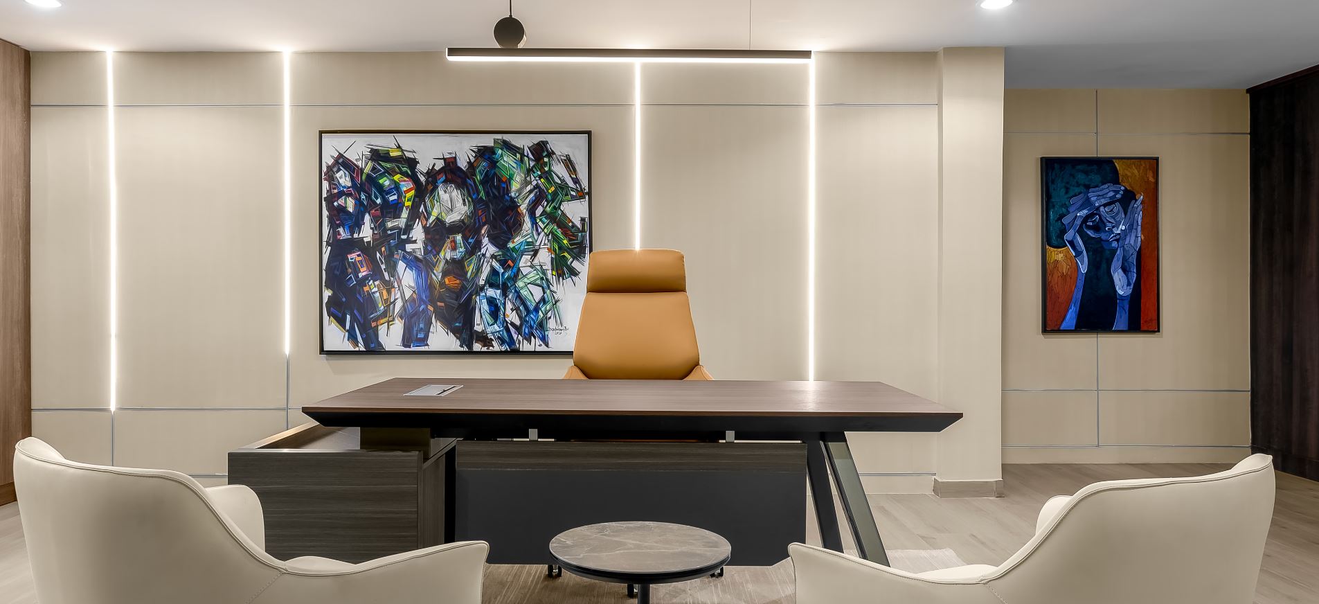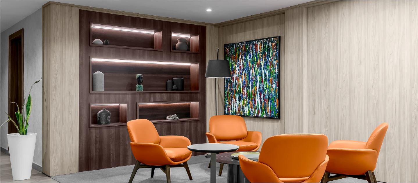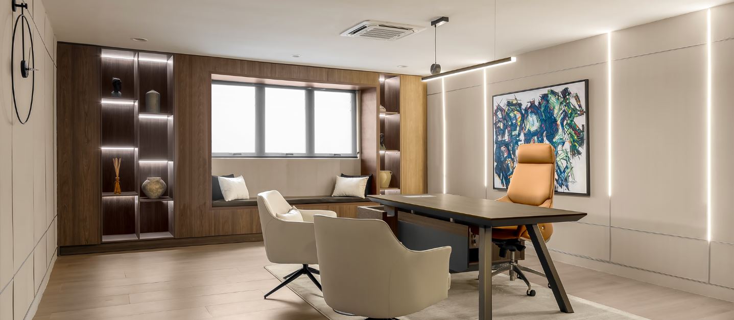 Wood, a central element in the design, was our idea to evoke warmth and character throughout the office. Each timber species, from Oak to Walnut, tells a unique story, enhancing the organic aesthetic envisioned for the space. Bold accent hues like mustard and orange were strategically introduced to infuse vitality, reflecting the client's dynamic approach to work and innovation.